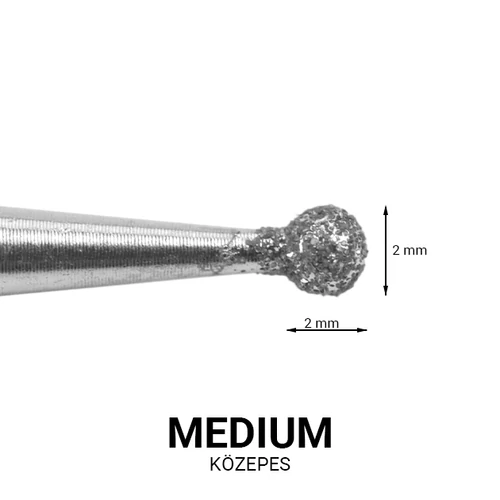 Diamond ball grinding head, medium fineness. Used in two directions for cleaning and lifting cuticles and cuticles during machine manicure. Recommended speed: 12,000. Grinding head diameter: 2mm